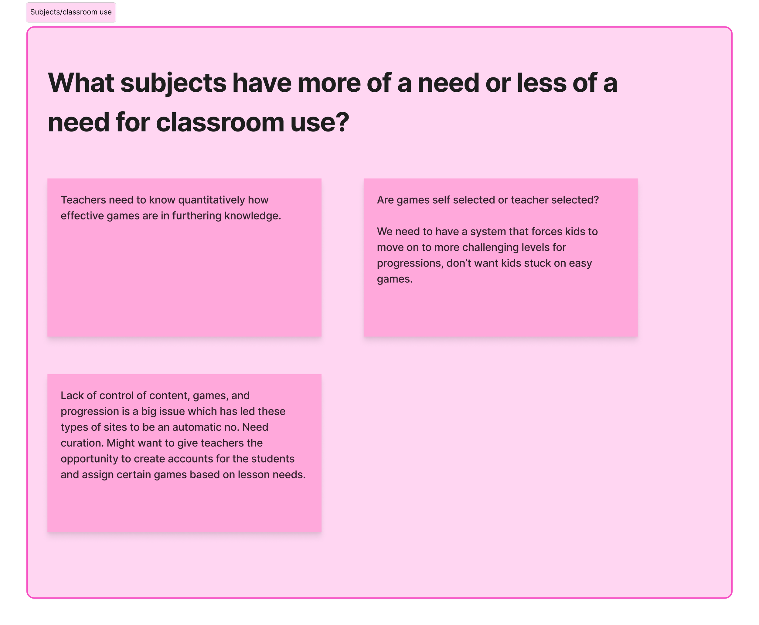I conducted informal interviews with public school teachers to understand their usage of games in the classroom and their perceptions on the current gaming platform. Interviews were ad-hoc, happening throughout the project via phone and Google Meet. I recruited participants through my network and social media (LinkedIn, Facebook Messenger). Interviews were ongoing, meaning that they were done through the duration of the project to keep a user-centered perspective. Interviews were unscripted, though there were talking points prepared if conversations veered off topic.