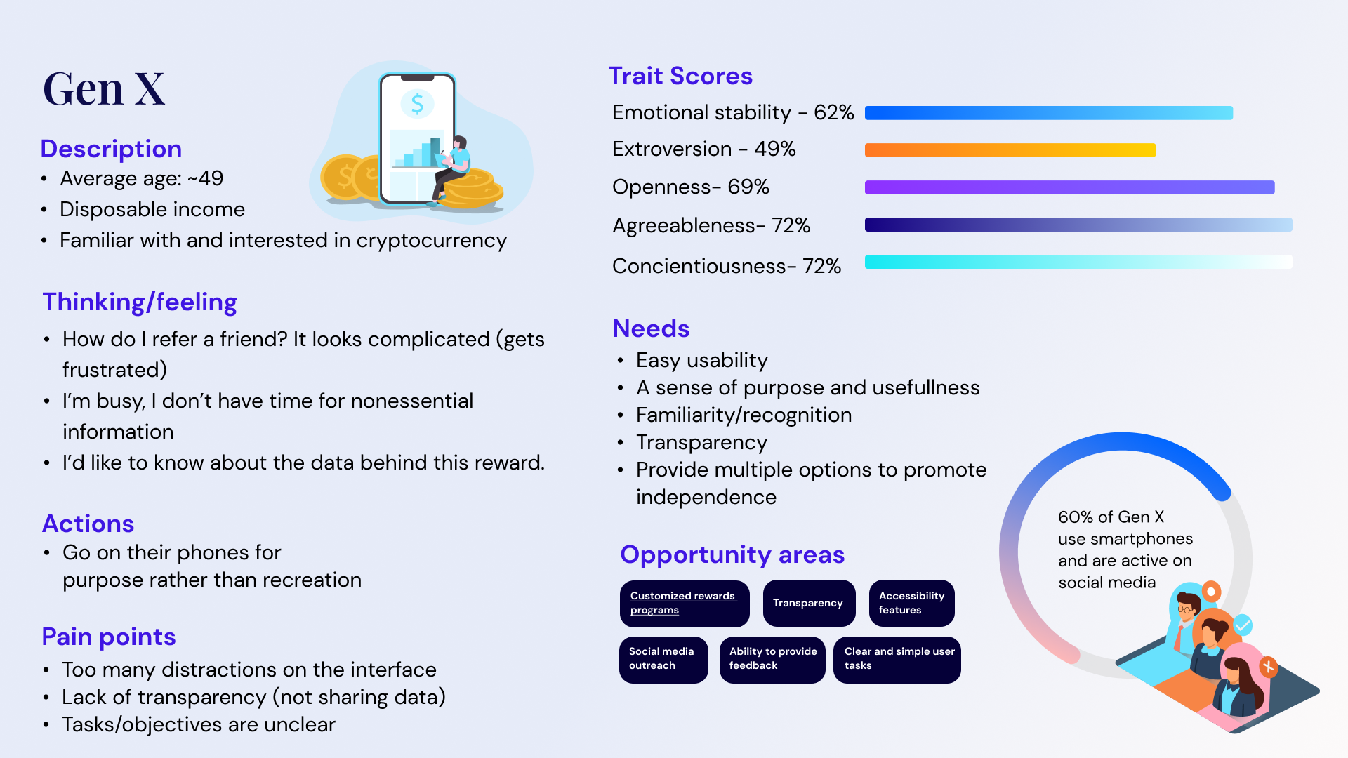 For Gen X, I chose a solid-colored background, straightforward language, and strong contrast. These decisions were informed by user research and archetypes, reflecting Gen X’s preference for transparency and a clear sense of purpose. The design aims to convey these values by minimizing distractions and focusing on clarity.