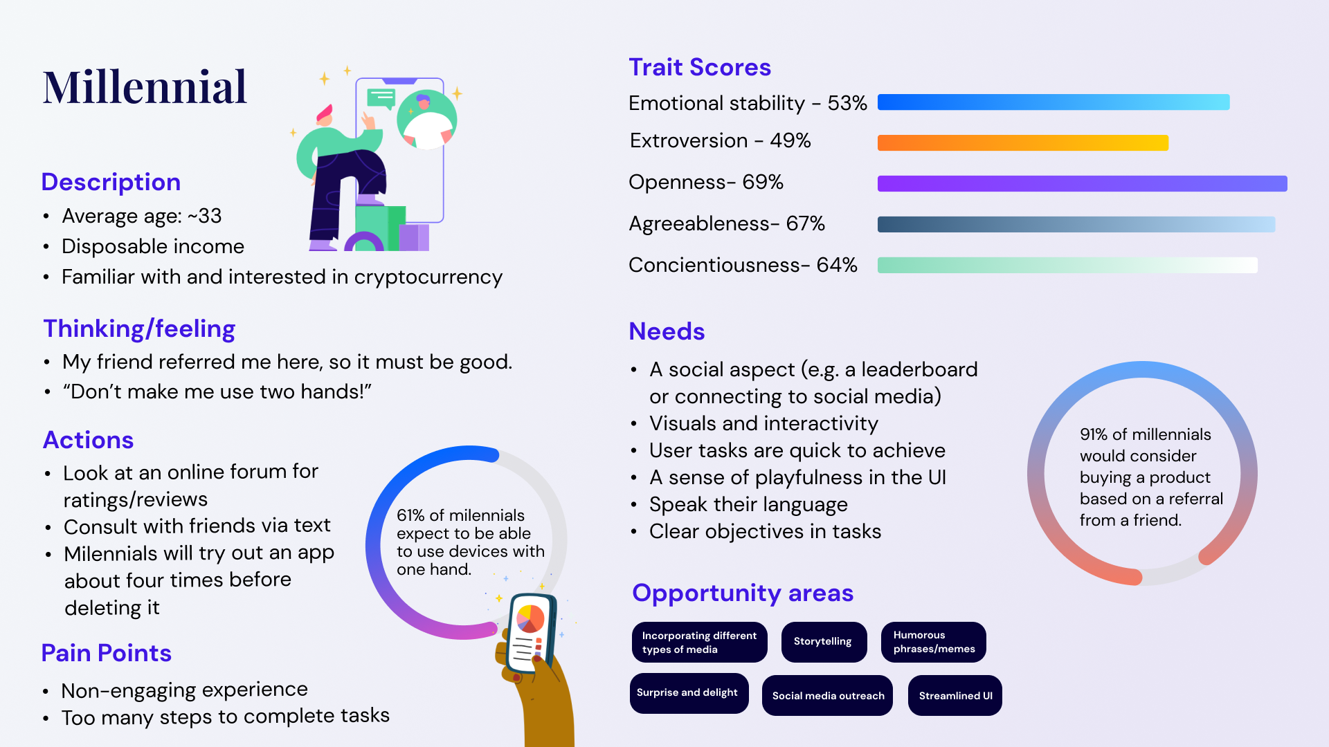 The design for millenials features an eye-catching background and playful language, both of which are intentional choices based on user research and archetypes. Millennials, in particular, respond well to engaging and interactive posts that incorporate playful and personable elements. These decisions were made to ensure the content resonates with the target audience, enhancing user engagement and connection.